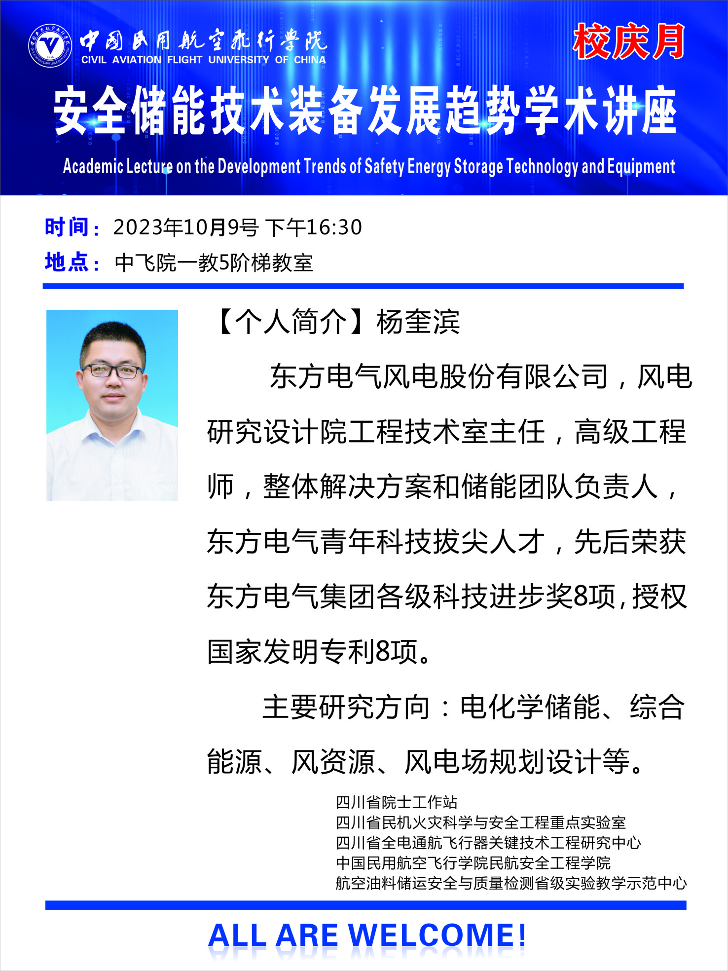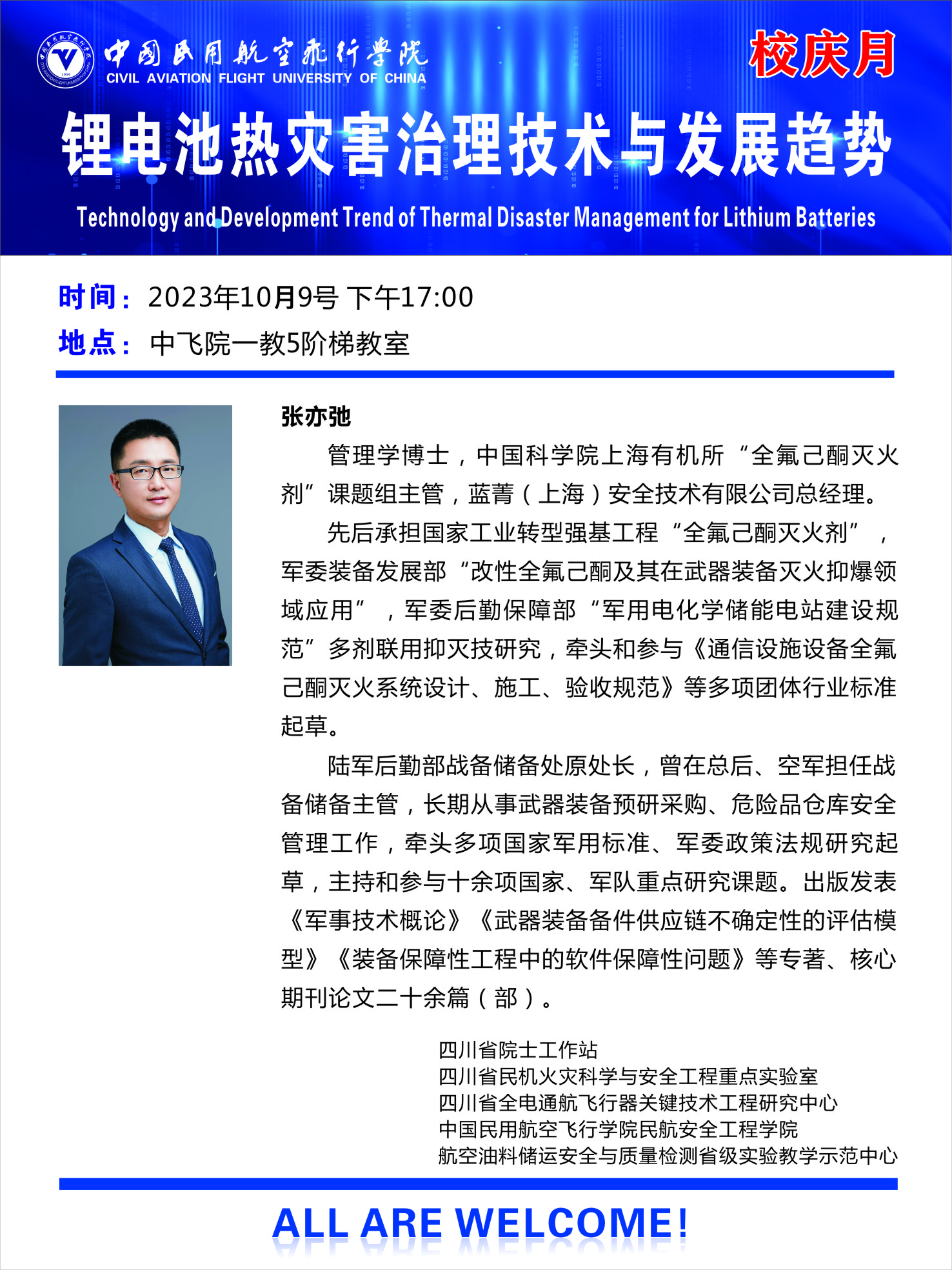2023年10月9日、10日,为营造良好的科研和学术氛围,庆祝中飞院建院67周年,扩大我校在行业内的科研影响力、提高我校师生的科研素养,安工院特邀请教育部“长江学者”、清华大学“百人引进”特聘教授张辉、蓝菁(上海)安全技术有限公司总经理张亦弛、东方电气风电股份有限公司高级工程师杨奎滨,来LETOU官网开展专家主题学术讲座。安工学院院长贺元骅、副院长何强、教师代表、全体研究生和本科生代表参加了讲座。本次讲座由LETOU国际米兰官网、民机火灾科学与安全工程四川省重点实验室、四川省第十批院士工作站、中国科协学风传承示范基地、四川省全电通航飞行器关键技术工程研究中心等单位共同承办。