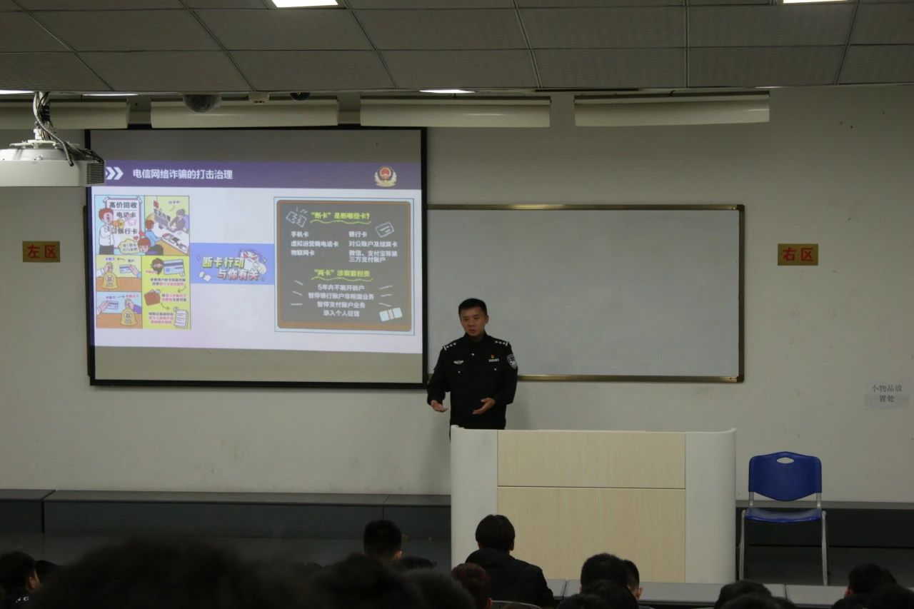 在宣讲会中,曾阳警官向同学们普及了各类大学生安全问题,引起了广泛的关注和共鸣。其中,网络安全问题中的网络诈骗成为了重点。曾阳警官详细解读了网络诈骗的种类和手段,提醒同学们警惕虚假信息、谨慎处理个人隐私,以及不轻信陌生人的诱导。