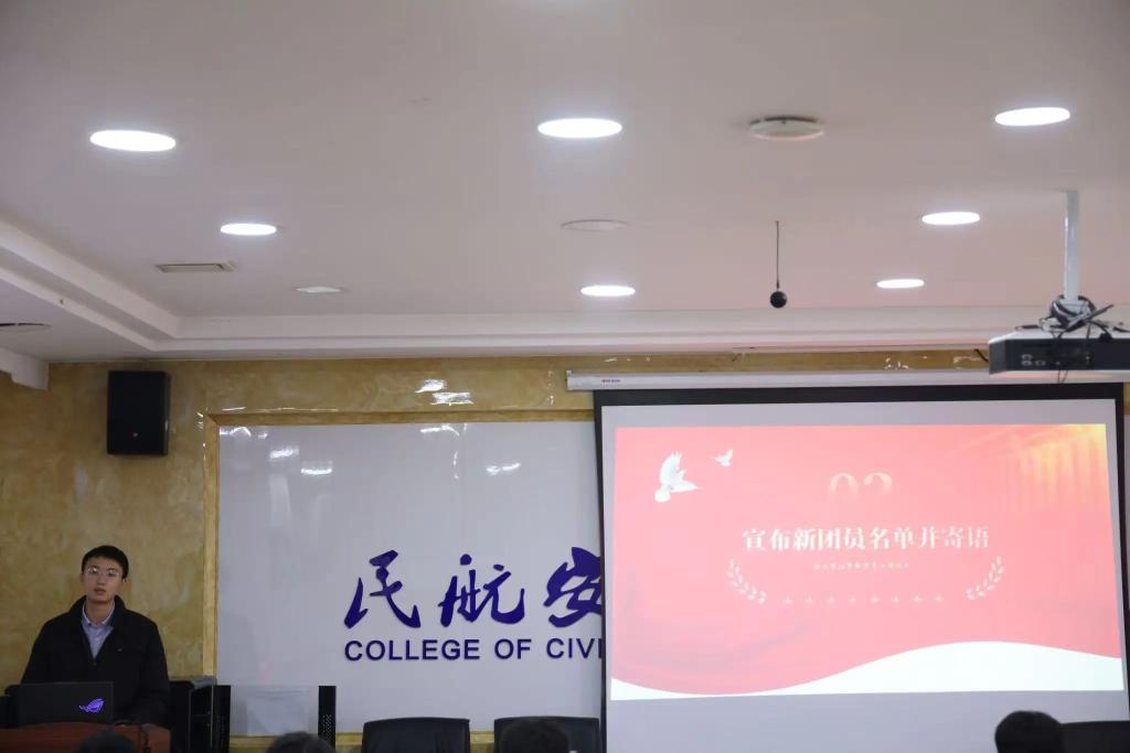 杨阳老师宣读2024年新发展团员名单并对新团员表示祝贺。经各团组织推荐、培养及考察,本年共有38名先进青年学生发展入团。杨阳老师向新团员提出希望和要求,期望新团员牢记使命,严于律己,勤奋学习知识、积极参与社会实践并追求思想进步,努力成为党和国家的栋梁之才。