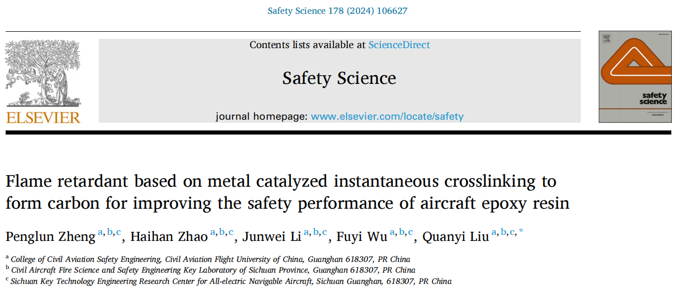 LETOU国际米兰官网刘全义教授团队在安全类TOP国际期刊《Safety Science》上发表论文“Flame retardant based on metal catalyzed instantaneous crosslinking to form carbon for improving the safety performance of aircraft epoxy resin”。该期刊系SCI检索期刊,中科院1区TOP期刊,JCR 1区,最新影响因子6.1。该期刊旨在发表安全管理、风险评估、事故分析、安全文化、安全技术等安全科学领域的原创研究。论文的第一作者为郑鹏伦副教授和在校研究生赵海涵同学,刘全义教授为论文的通讯作者。该成果得到了国家自然科学基金(U2033206)和民机火灾科学与安全工程四川省重点实验室基金(MZ2022JB01)的支持。