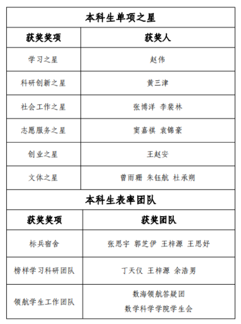 11月16日,2022年“数学之星”评选正式启动。经“数学之星”评审委员会函评与学院内公示, 赵伟、黄三津、窦嘉祺、王浩天、姜亦申、刘泽蕙等15人获评单项之星,数海领航答疑团等6支团队获评表率团队,许多、李泽彤、岳泽阳、陈永鑫、于晟伟、穆欢等29人获评优秀奖,KY开元集团官网入口学生会等6支团队获评优秀团队。