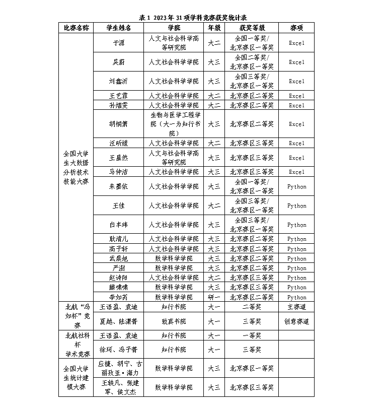 通过“冯如杯”、“统计建模大赛”、“大数据分析大赛”等学科竞赛,北航学子展现出了卓越的统计能力和综合素养,也激发了他们运用统计方法和大数据技术解决实际问题的热情。学科竞赛成果展示了KY开元集团官网入口的校级一流本科课程《回归分析》《统计学导论》等统计课程的教学成果和育人成效,有力地支持了统计学国家级一流本科专业建设点和北航新文科的建设。