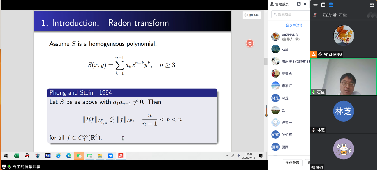 报告人简介: 石坐顺华,中南大学副教授,研究方向为调和分析,2014 年在中国科学院大学获博士学位,曾于中国科学院数学所从事博士后研究,已在高水平数学期刊发表论文十余篇。范智杰,现为广州大学博士后,1994年生于广东省广州市。2016-2021年期间在中山大学师从颜立新教授取得博士学位,读博期间获得中山大学研究生国际合作交流项目资助赴澳大利亚麦考瑞大学访问Ji Li 和Xuan Thinh Duong教授一年,2021-2023年期间在武汉大学跟从洪桂祥教授做博士后。范智杰主要研究齐型空间中的调和分析,与微分算子相关联的调和分析、非交换调和分析等。在J. Fourier. Anal. Appl, J. Geom. Anal, Studia. Math, J. Math. Soc. Japan, Michigan. J. Math等数学期刊共发表或接受论文7篇,另有1篇论文在J. Funct. Anal期刊二审小修中。
