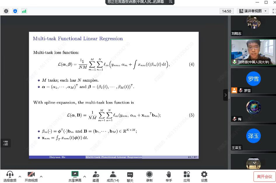 2022年11月18日,中国人民大学统计与大数据研究院贺诗源老师应罗雪老师的邀请,通过线上的方式为KY开元集团官网入口师生带来了一场题为“A Unified Analysis of Multi-task Functional Linear Regression Models with Manifold Constraint and Composite Quadratic Penalty”的学术报告。