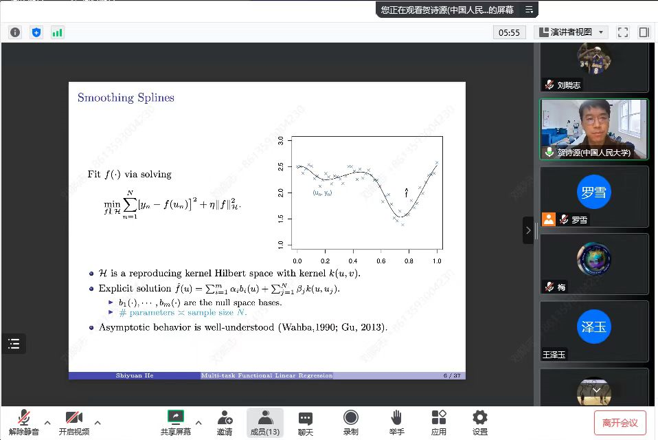 报告首先介绍了多任务函数线性回归模型,使用惩罚样条来平衡偏差、方差和计算复杂性。然后介绍了在样条系数矩阵上的具有双重正则化的通用模型:矩阵流形约束以及作为二次项总和的复合惩罚。接着证明复合惩罚诱导了一个特定的范数,通过通用链接将切线空间子集的复杂度桥接到测地线邻域的复杂度。得到统一的收敛上界,并具体应用于降秩模型和图拉普拉斯正则化模型。陈迪荣老师参加了本次学术报告,参会师生与贺诗源老师进行了积极的交流和探讨。