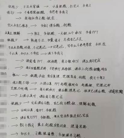 新式座谈与每位同学都交谈了近20分钟,两场座谈每场都持续了近4个小时,共与20多名班级中选出的同学代表进行了深度交流。交流中每一位学生都针对前半学期中的学习习惯、方法进行了分析,并制定了适合自己未来一个月学习数学分析的详细学习计划,增强了期末取得理想成绩的信心。