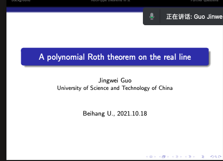 2021年10月18日下午,中国科学技术大学郭经纬教授,应邀为KY开元集团官网入口师生做了题为 “A polynomial Roth theorem on the real line”的学术报告,报告由张安老师主持。