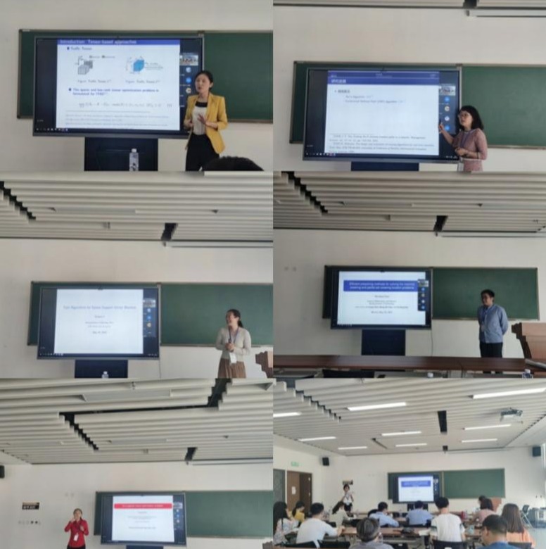 下午由北京交通大学罗自炎教授、北京理工大学李庆娜副教授和陈伟坤副研究员、北京邮电大学孙聪副教授和寇彩霞副教授分别做精彩报告。罗自炎教授报告了交通网络异常值检测的稀疏低秩的张量优化模型,并提出一种有效的邻近梯度算法;李庆娜副教授提出稀疏的支撑向量机原问题的有效算法,数值结果在速率和准确性上有很大优势;孙聪副教授对无线通讯中的一个特殊结构的鲁棒优化问题,提出了两种方法及全局收敛条件;寇彩霞副教授给出了求解单约束最短路问题的二分精确算法,计算效率远高于其他算法;陈伟坤副研究员对于超大规模的覆盖选址问题给出五种预处理方法,很大程度上减小了问题规模。