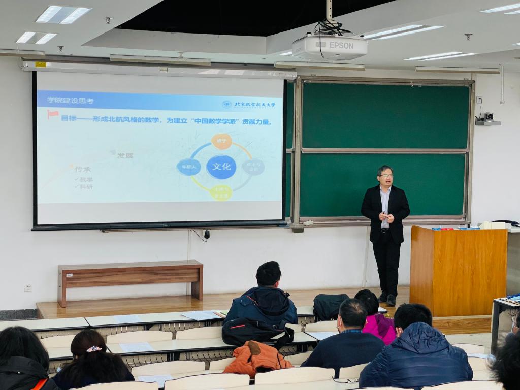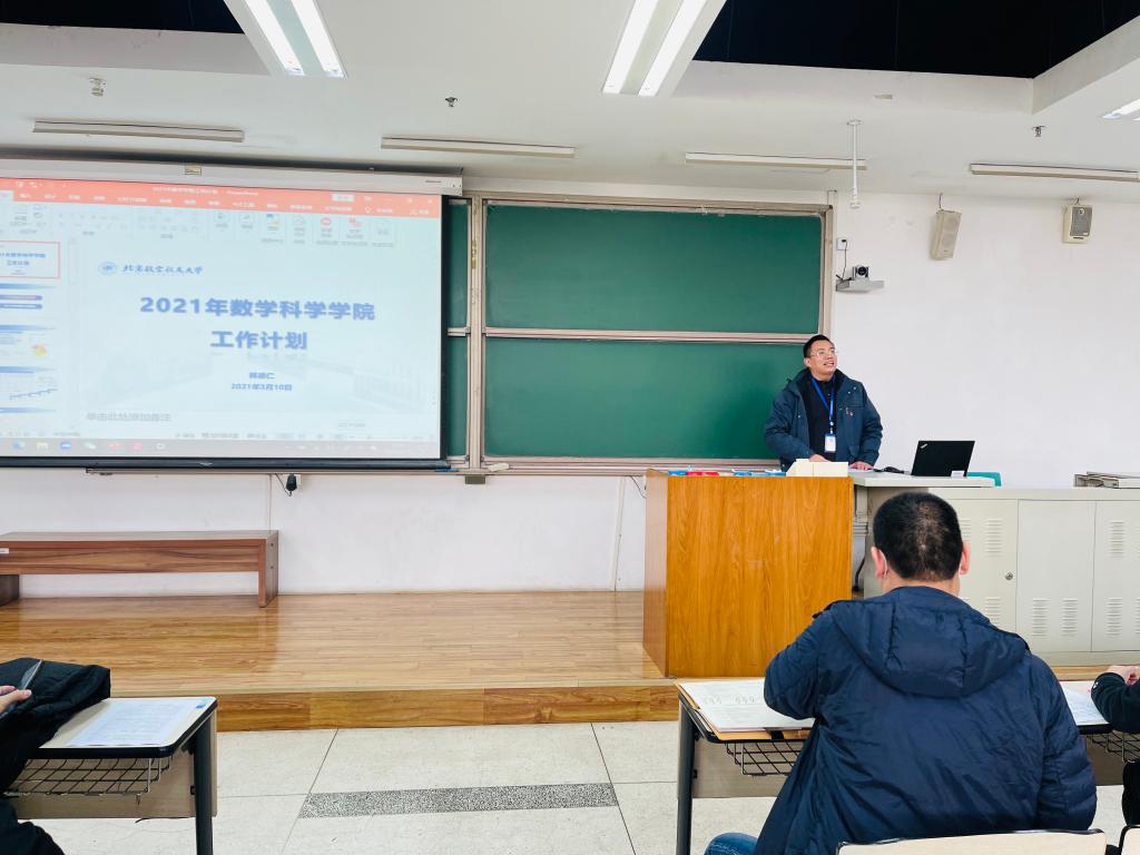 会上,院长韩德仁首先做了全院工作报告。从师资、教学、科研等方面总结了过去一年取得的各项成绩,并结合第五轮学科评估对学院的优势和不足进行全面分析。随后传达了学校2021年工作要点,对学院2021年工作要点及重点工作、“十四五”建设目标等做了解读和部署。韩院长表示,学院要做好传承,推动发展,努力形成北航风格的数学学院,为建立“中国数学学派”贡献力量。