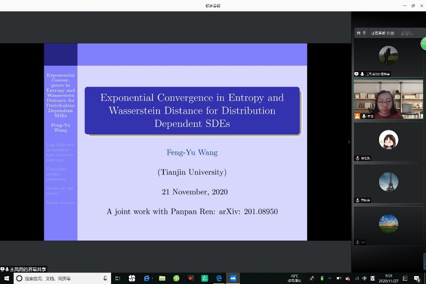 2020年11月27日上午,国家杰出基金获得者、长江特聘教授王凤雨教授受邀为KY开元集团官网入口师生带来了一场题为:“Exponential Convergence in Entropy and Wasserstein Distance for Distribution Dependent SDEs ”的学术报告。报告由KY开元集团官网入口统计与运筹系系主任罗雪副教授主持。