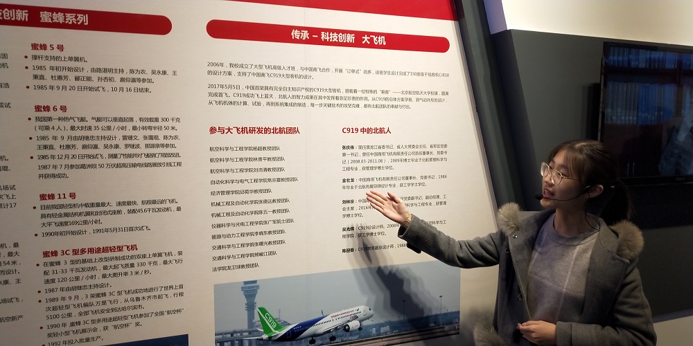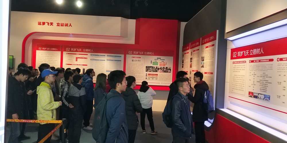 最后,同学们来到了“砥砺奋进,空天报国“——五年成就展。”五年成就展“集中展示了党的十八大以来,北航人不忘初心,跨越发展的五年,总结了五年来北航在学科建设、人才培养、人才引育、科研创新、国际交流合作、民生、党建等方面的历史成就。同学们领略到北航灿烂的成就,体会到数十载北航人艰苦奋斗精神的传承。