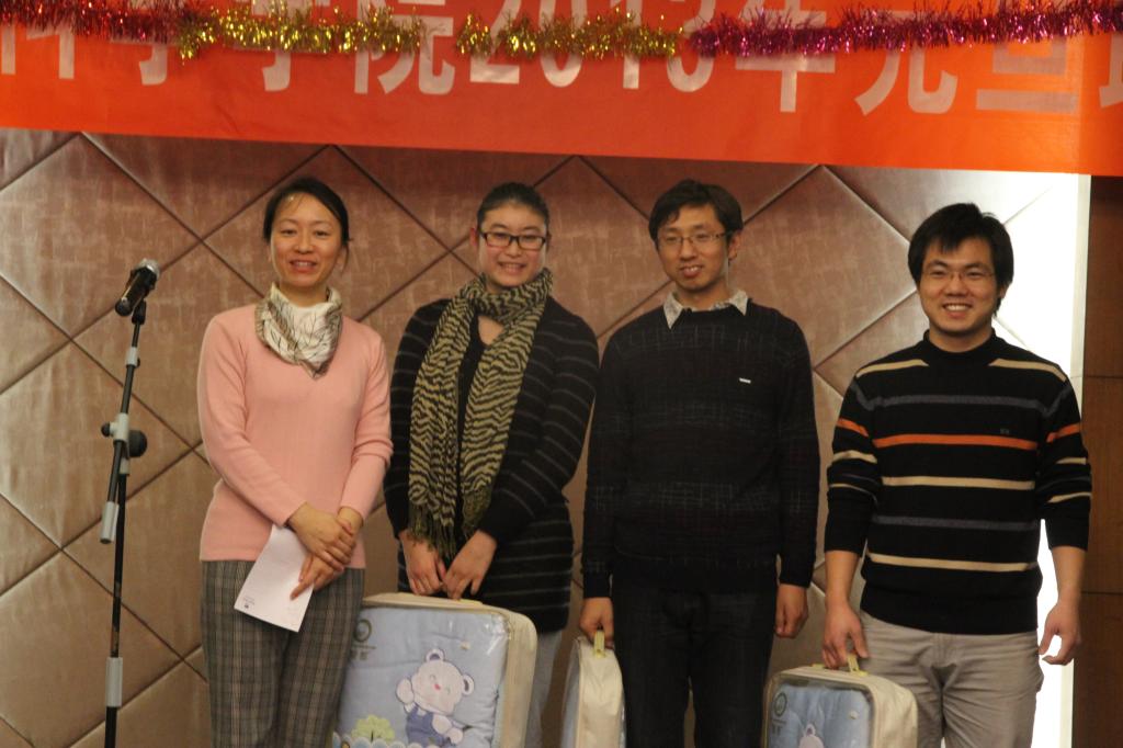 钟声敲响,新春起航,2012年12月28日下午4:00数学与系统科学学院在丽亭华苑酒店举行元旦联欢会,在笑声与歌声汇成的海洋里,在这个温馨和喜庆的日子里,中科院数学与系统科学研究院林群院士,北航副校长郑志明教授,国际交流合作处马进喜处长等与学院全体领导班子及教职工共庆2013年新年到来。 中科院林群院士对北航数学学院的发展寄语了美好的期望。副校长郑志明教授对学院2012年的工作给予了充分的肯定,并希望在2013年学院能继续保持上扬的势头,在教学、科研、国际合作方面取得更大的突破。 学院院长郑志勇教授介绍了学院在2012年在学科建设、人才培养、师资队伍、合作与交流方面取得成绩,表示所有的这些成就都凝聚着全院教职工的心血和汗水,希望在崭新的一年里,学院上下继续坚持“以人为本,科学发展”的基本理念,团结努力,攻坚克难,使得学院各项工作进一步走上新台阶,切实实现学院又快又好地健康发展。最后,郑志勇院长对全院教职工表达了真诚的新年祝愿,书记李红捷同志介绍了学院在党务和制度梳理方面做出的突出工作,希望希望大家能够在新的一年里再接再厉,脚踏实地,开拓进取,团结拼搏,进一步推动学院的可持续科学发展。李书记也为2012年新婚和诞生小孩的教职工颁发了礼品。现场气氛十分热烈。