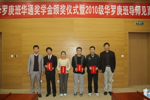 11月12日下午,正值华罗庚先生诞辰102周年,首届华罗庚班华通奖学金颁奖仪式暨2010级华罗庚班导师见面会在新主楼第八会议室举行。中国科学院数学与系统科学研究院林群院士、洪佳林副院长、高小山副院长等领导和专家学者;北航校长怀进鹏院士、教育基金会秘书长黄正,数学与系统科学学院的领导班子成员;山西华通路桥集团特别代表王宗英先生,以及2010、2011级华罗庚班全体同学参加了会议。仪式由数学与系统科学学院郑志勇院长主持。