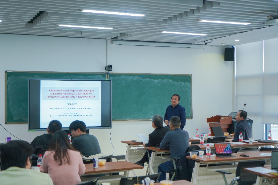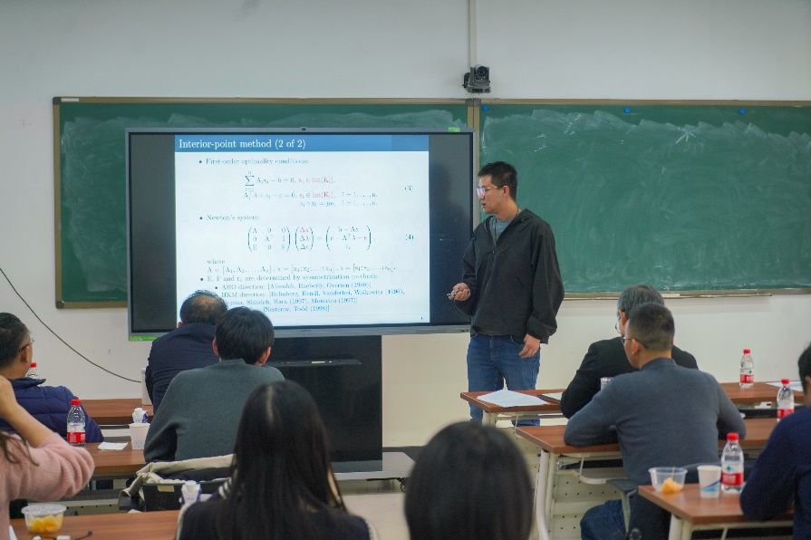 南开大学张瑞进作《对称锥规划的原始-对偶内点松弛方法》报告。他提出了一种新的原始-对偶内点方法,适用于热启动,并为Schur补矩阵提供了显式解,显著提高了计算效率。