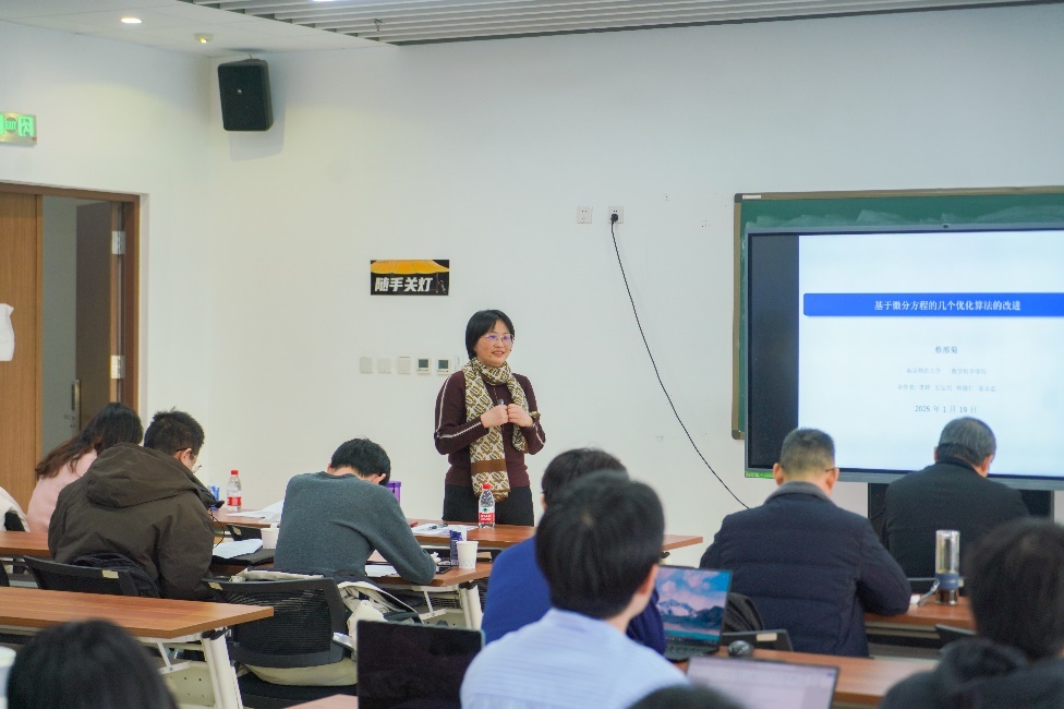 南京师范大学蔡邢菊教授作《基于微分方程的优化算法改进》报告。她介绍了将满足一定条件的优化问题转化为微分方程求解的方法,并针对凸和伪凸优化问题提出了一个新的改进的预测矫正算法,显著提升了算法的收敛性能。