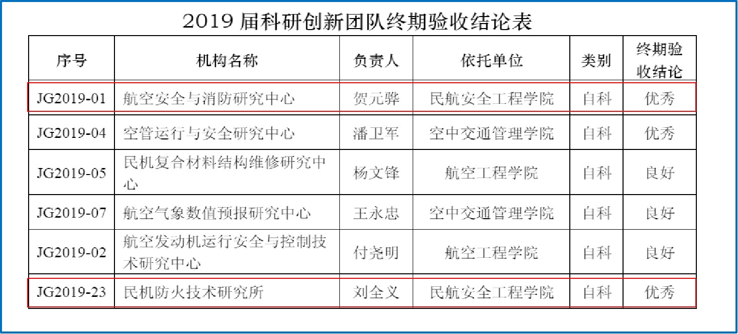 (1)建成2个优秀校级创新团队:航空安全与消防研究中心、民机防火技术研究所。